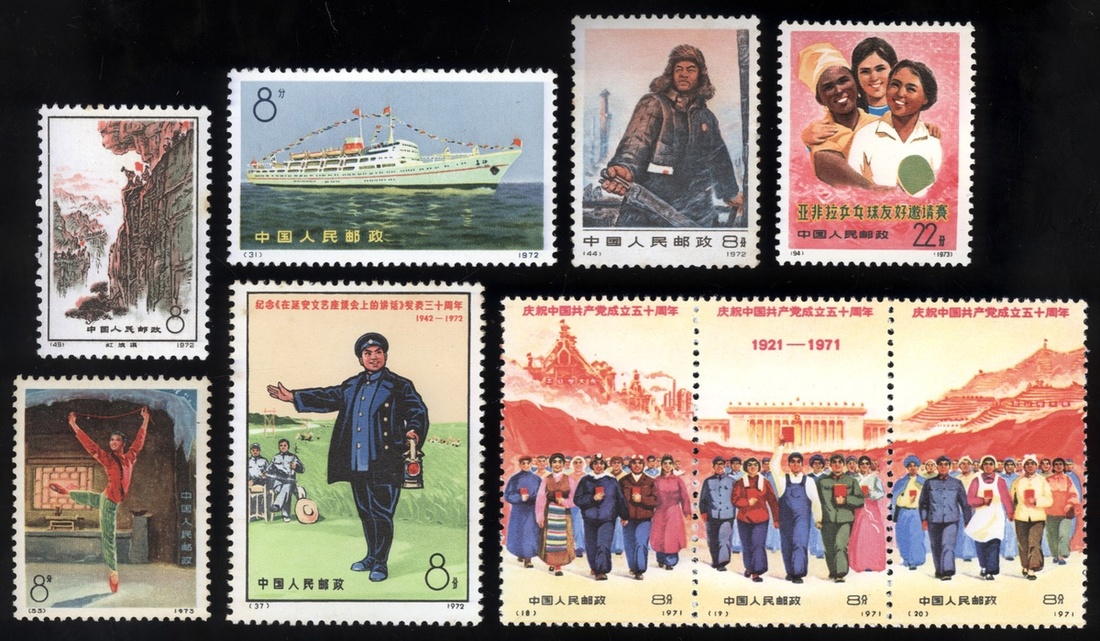 新中國編號新票一組,包括建黨,輪船,延安文藝座談會,王進喜,紅旗渠,白毛女,亞非拉乒乓球邀請賽,整體票面顏色鮮豔,齒孔完整,原膠,背膠泛黃,上中品