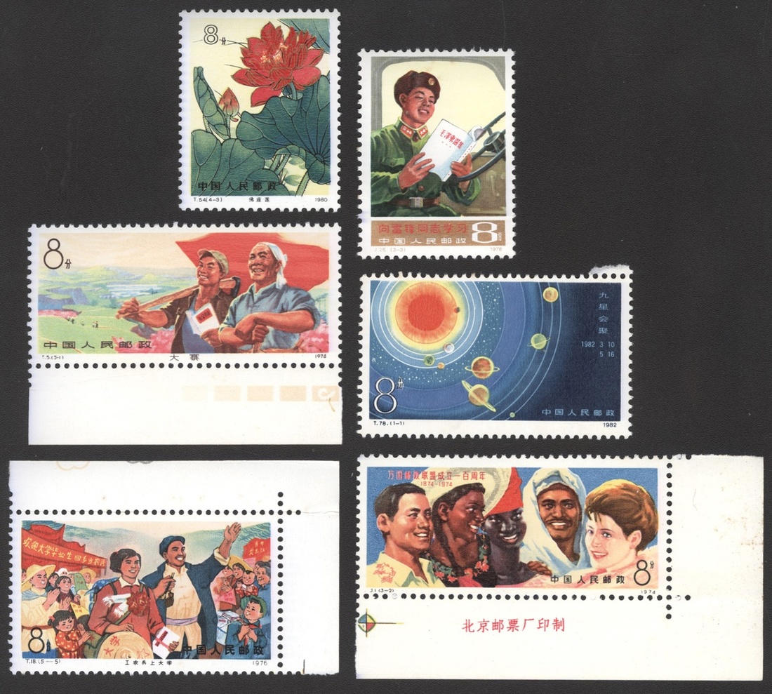 1974-82年新中國JT成套新票一組18套,包括萬國郵聯,武術,荷花,奔馬,留園,雜技,工農兵上大學,臉譜等,部分帶廠銘邊紙,票面顏色鮮豔,齒孔完整,原膠,背膠泛黃,上中品,內容豐富,市場價值高,請預覽