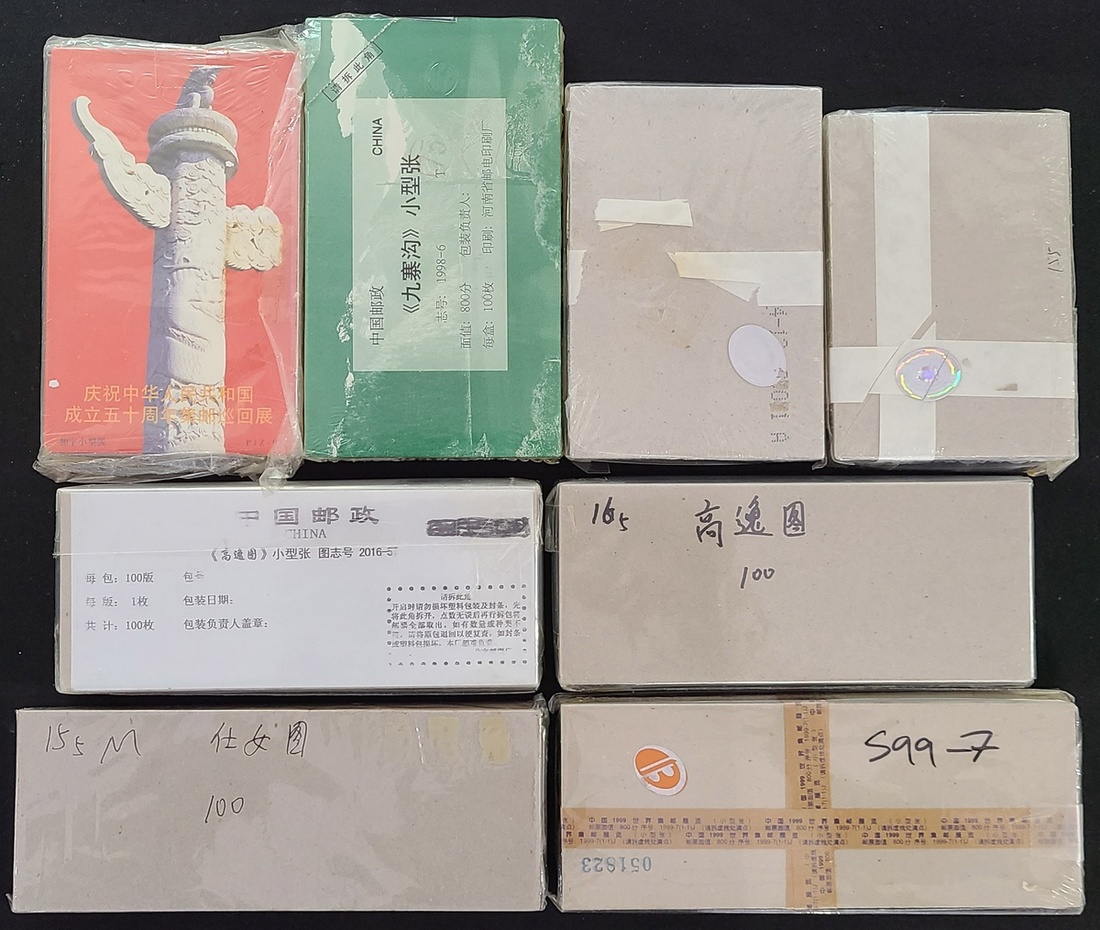 新中國100枚整盒編年小型張新票8盒,包括紅樓夢第一組,抗日,九寨溝,毛澤東加字,99世界郵展,揮扇仕女各一盒,高逸圖2盒,原封未拆,保存完好