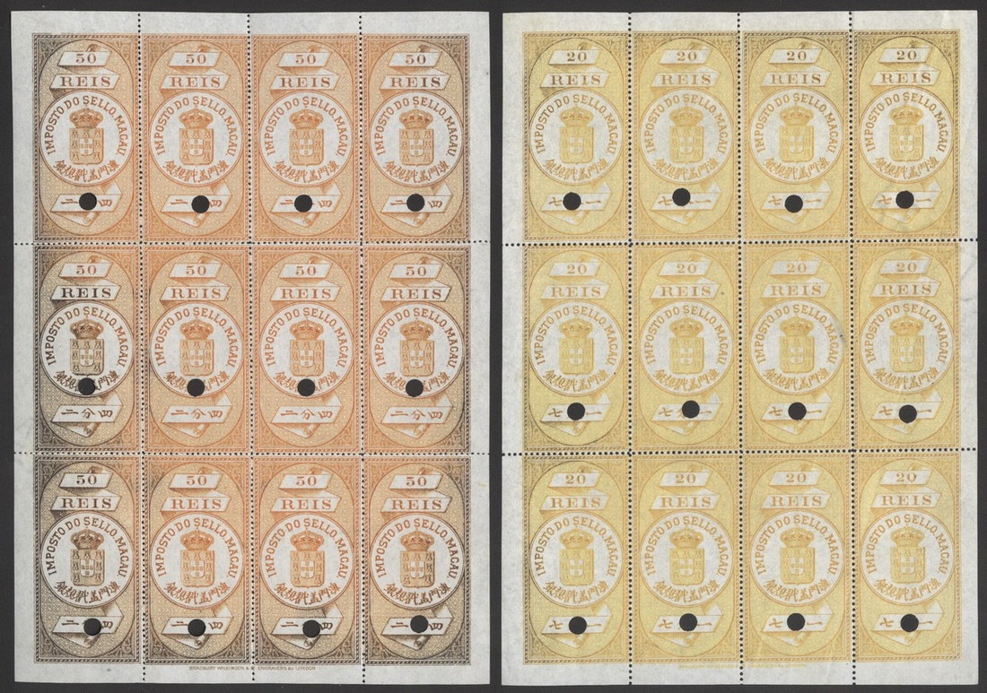1889 Revenue 20r. and 50r. sheet of twelve, each stamp with punch hole, unused.