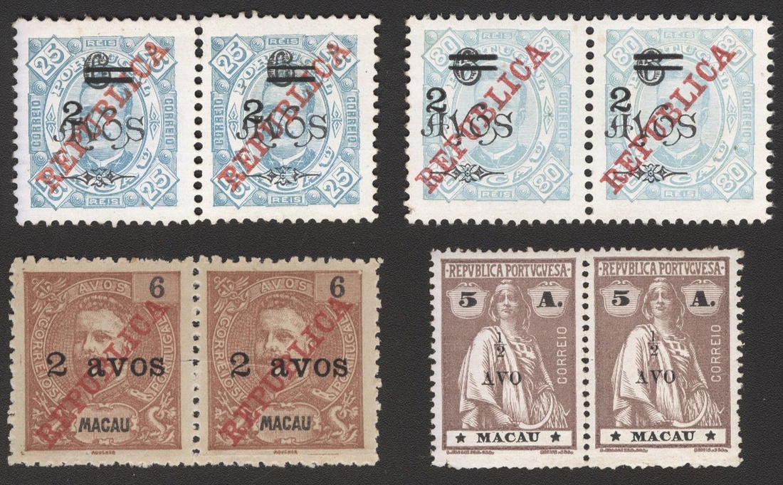 1919 D. Carlos I and Ceres I surcharged, 1/2a. to 2a., complete set of four, pair, unused, very fine, seldom to offer in pair. Yang 243-246. "Generally found cut with scissors at one side (between two stamps) official before sale."