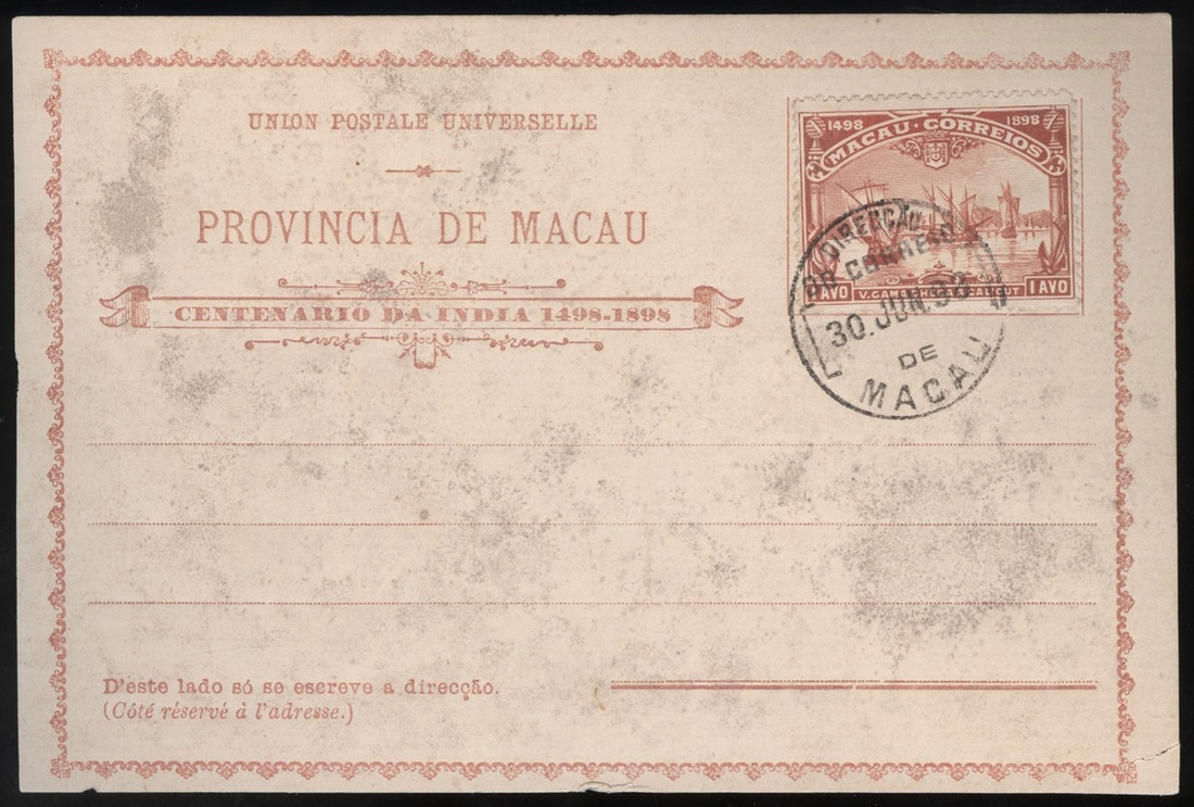 1898 (30 Jun.) Formular cards with Vasco Da Gama issue Adhesives Affixed by Post Office 1a. cancelled Macau c.d.s., unaddressed, cancel to order, fine.
