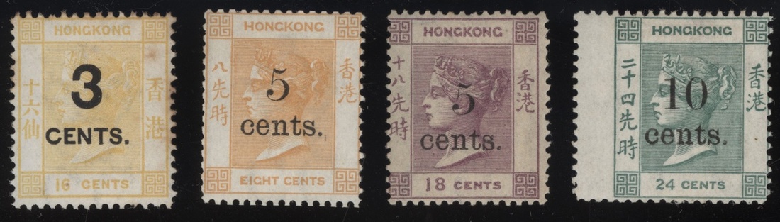 1880 surcharge 5c. on 8c., 5c. on 18c., and 10c. on 24c. with left wing margin, mint with part of original gum,fine, plus postcard stamp 3c. on 16c., mint, toning.