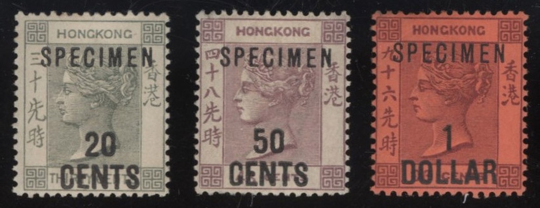 1891 The 4th surcharge issue (without Chinese character) 20c. on 30c., 50c. on 48c. and $1 on 96c. overprint "SPECIMEN" hinged with original gum, very fine.
