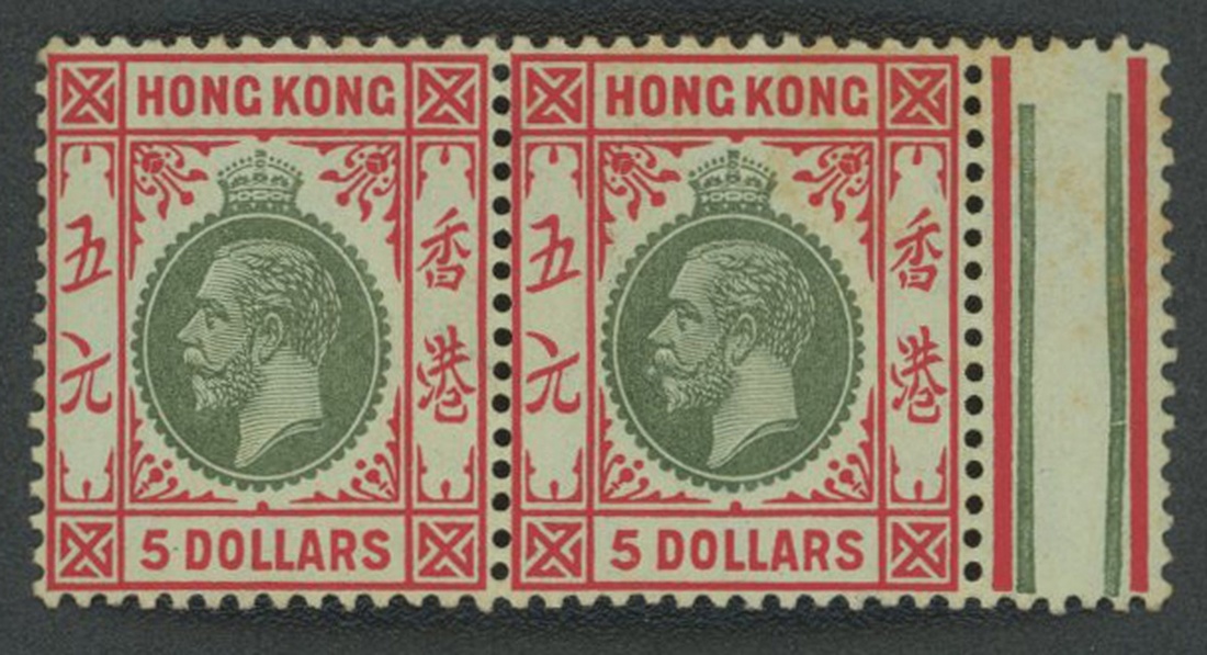 1912-1921 K.G.V. the 1st issue, $5 on olive paper back, horizontal pair with right interpanne margin, slightly toned, fine. Yang 114