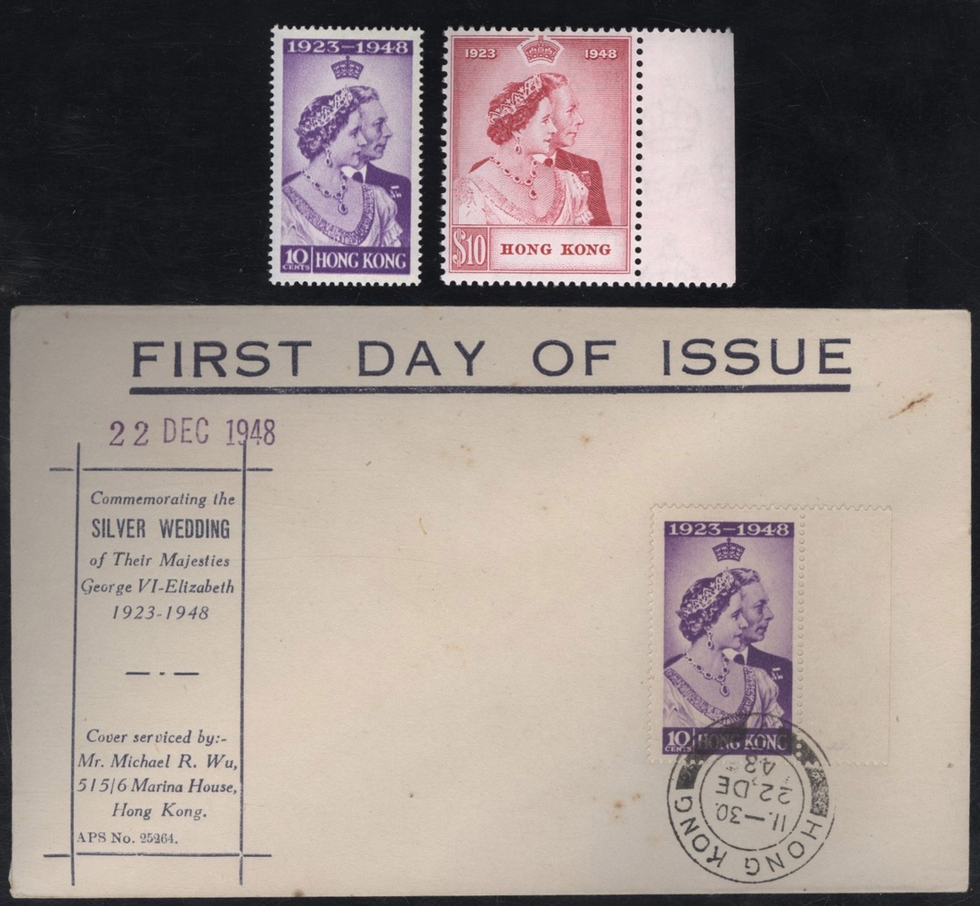 1948 (22 Dec.) Royal Silver Wedding 10c. and $10 with margin, unmounted mint, very fresh, and 10c. first day cover.