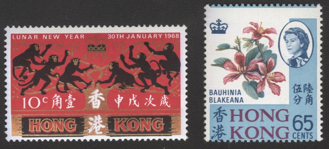 1968 HK Bauhinia Blakeana 65c. unmounted mint with perforate misplaced variety, Year of Monkey 10c. black shift down 1mm variety, very fine.