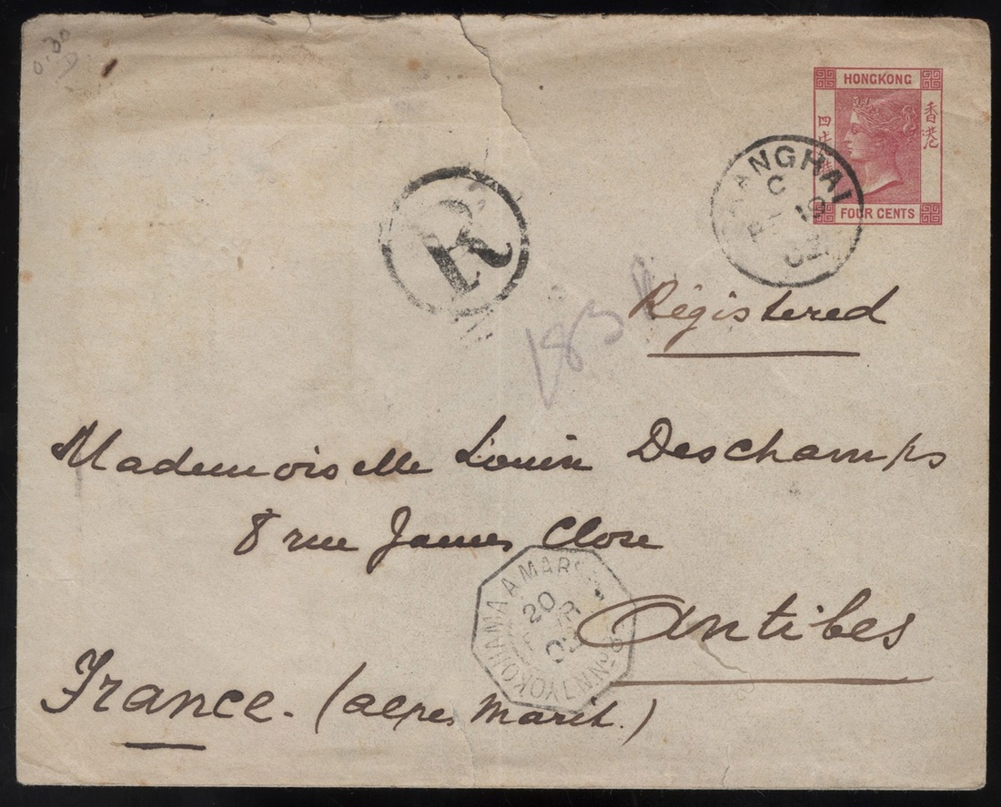 1902 (19 Feb.) A Q.V. pre-stamp envelope 4c. carmine registered to France, tied by Shanghai c.d.s. showing circle "R" registered h/s, probably stamps missing.