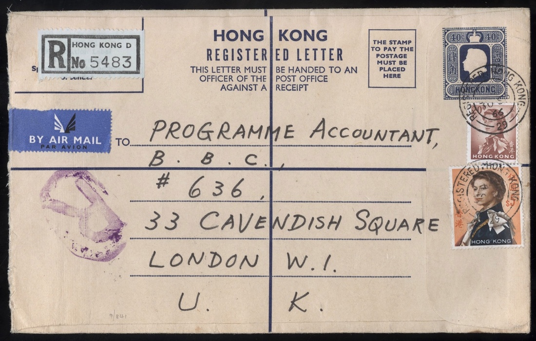 1966 (30 Sep.) QEII 40c. H size registered letter envelope to U.K. bearing 20c. and $5 tied by Hong Kong c.d.s., fine.