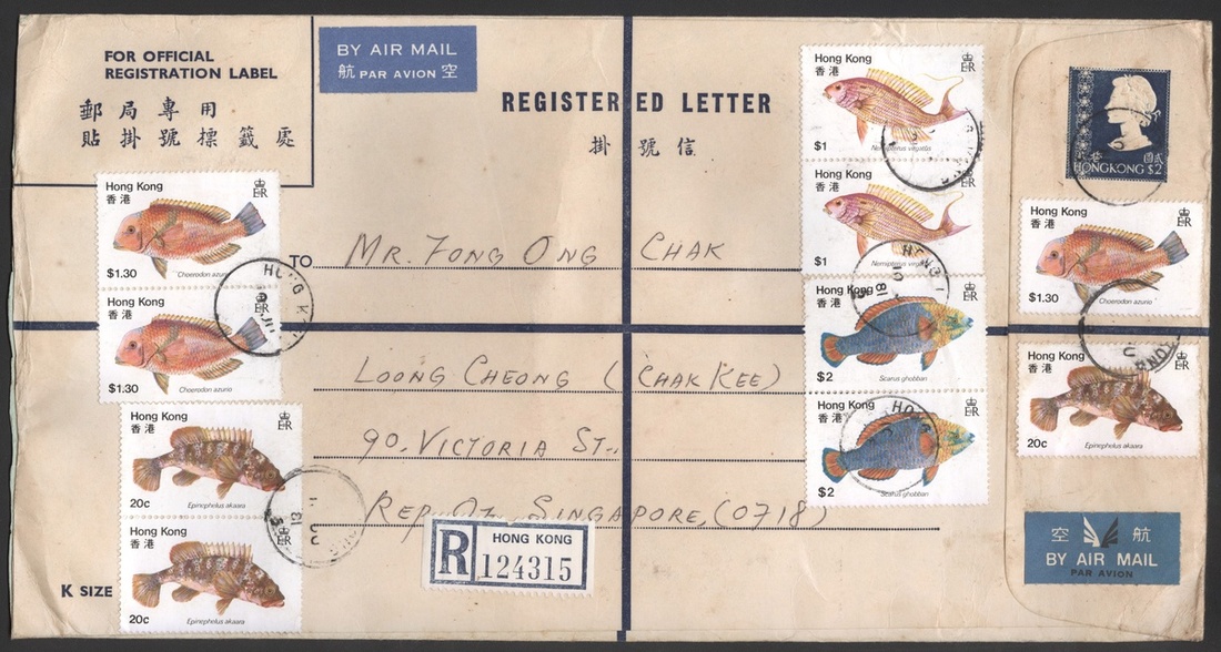 1981 (10 Jun.) QEII $2 K size registered letter envelope to Singapore bearing 20c.(3), $1(2), $1.30(3) and $2(2) tied by Hong Kong c.d.s., fine.