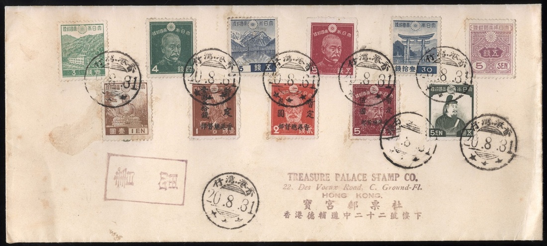1945 (31 Aug.) envelope bearing various stamps used during Japanese Occupation with Hong Kong postmarks. The Japanese surrendered on 15th Aug. 1945 at Hong Kong and handed over Hong Kong to the Royal Navy on 30th Aug. 1945.