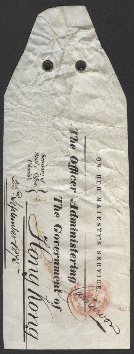 1875 (22 Sep.) a Tab of parcel bag. London to Hong Kong, cancelled by red "LONDON PAID" on front, on reverse with "SINGAPORE TO HONG KONG Marine Sorter" double ring (11.18) c.d.s. very fine and unusual.