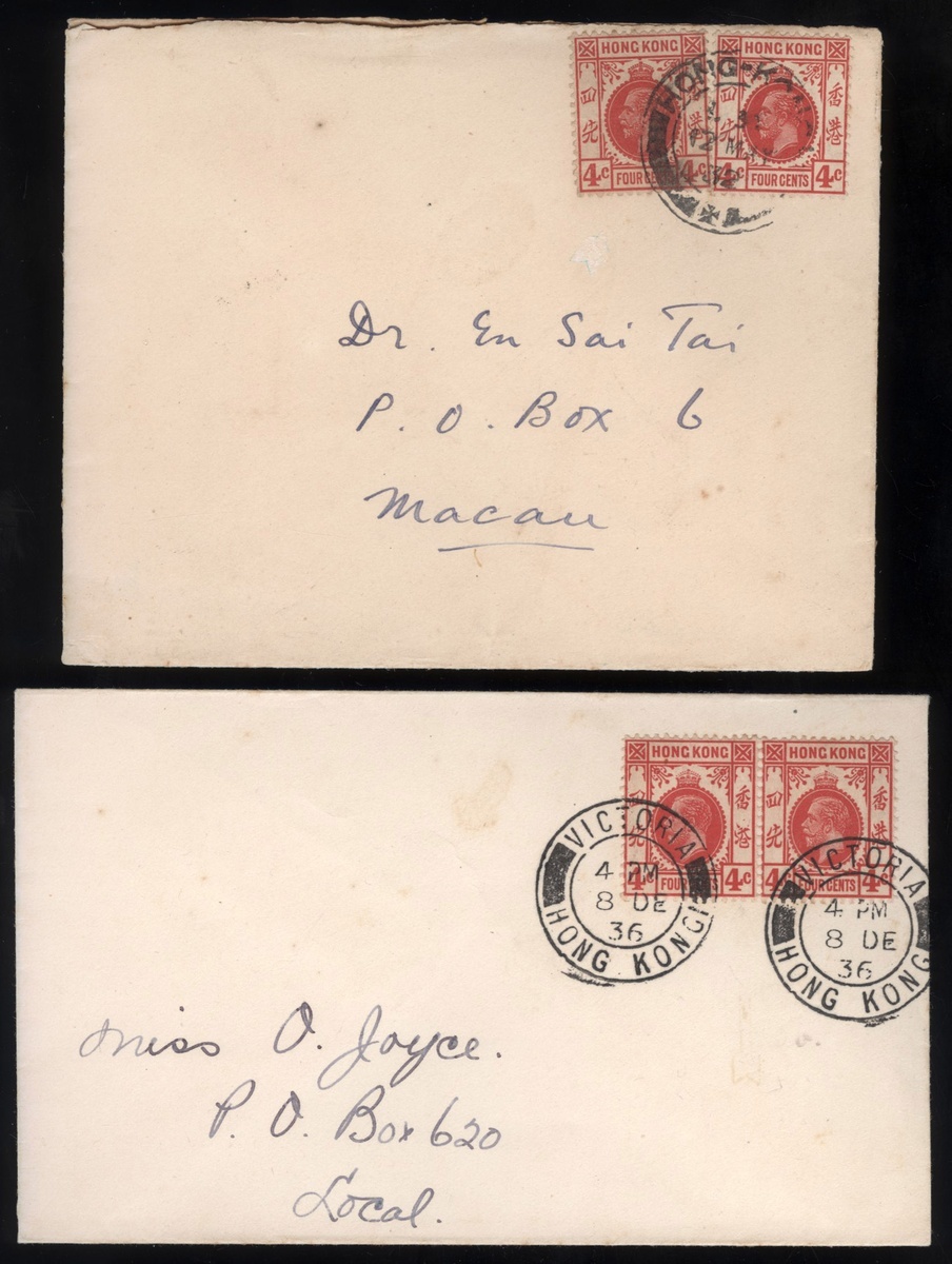 1921 KG V The 2nd Series 4c. Chinese Char "Kong" broken at top strokes: 1936 (8 Dec.) Hong Kong to local cover, bearing two KG V 4c. ( one is broken "Kong" ). and other cover to Macau with two KG V 4c. (the left one is the retouching issue.). With a description of this broken " Kong" stamp.