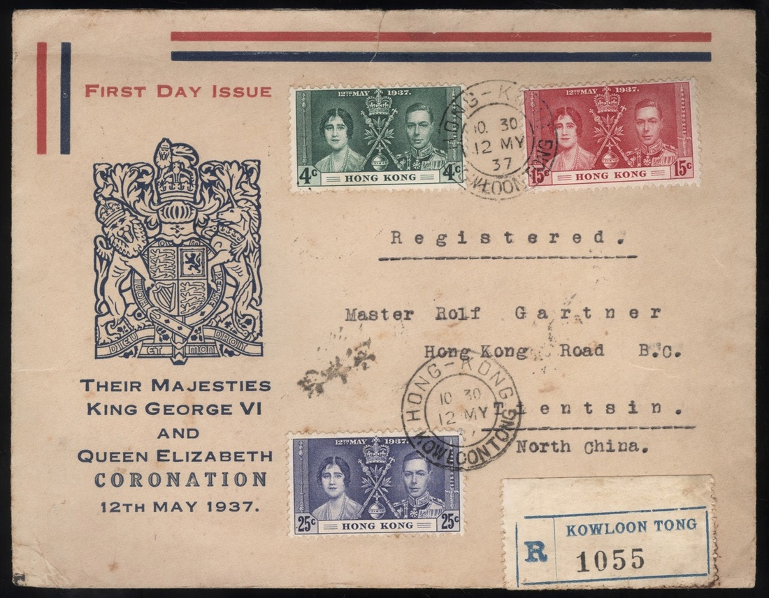 1937 (12 May) Coronation set cacheted registered first day cover to Tientsin tied Kowloon Tong c.d.s., showing registered label alongside, on reverse Tientsin(18.5) arrival c.d.s.,