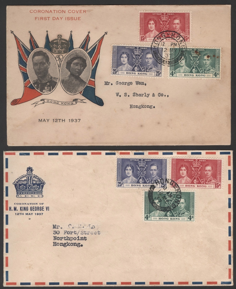 1937 (12 May) two Coronation cacheted first day envelopes, one cancelled by herring-bone c.d.s., another cancelled by Hong Kong (Webb type: M) c.d.s., the last day useage recorded by Webb, cover lightly soiling.