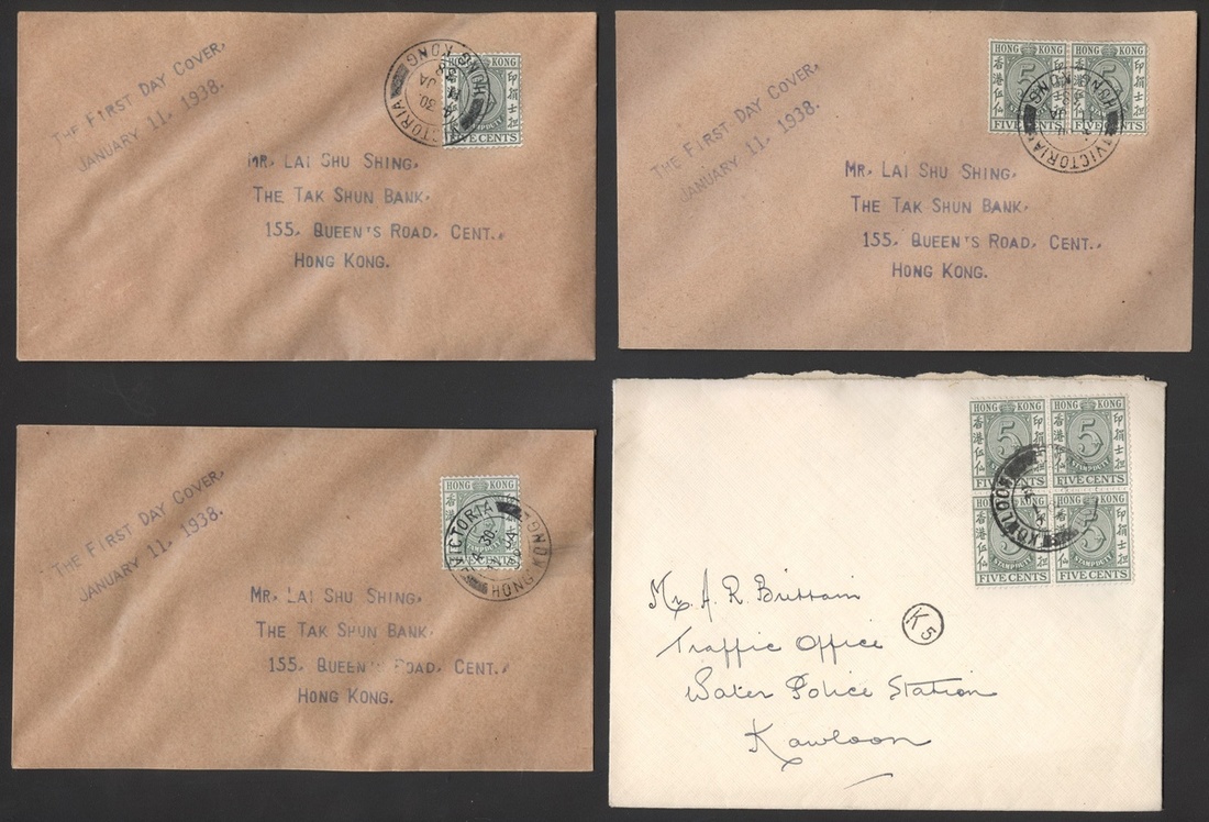 1938 a group of four covers bearing Hong Kong five cents revenue for postage stamp usage.