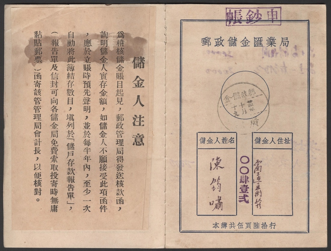 1935 a deposit book of the Postal Savings and Remittance Bureau of China. A postal savings withdrawal slip is enclosed.