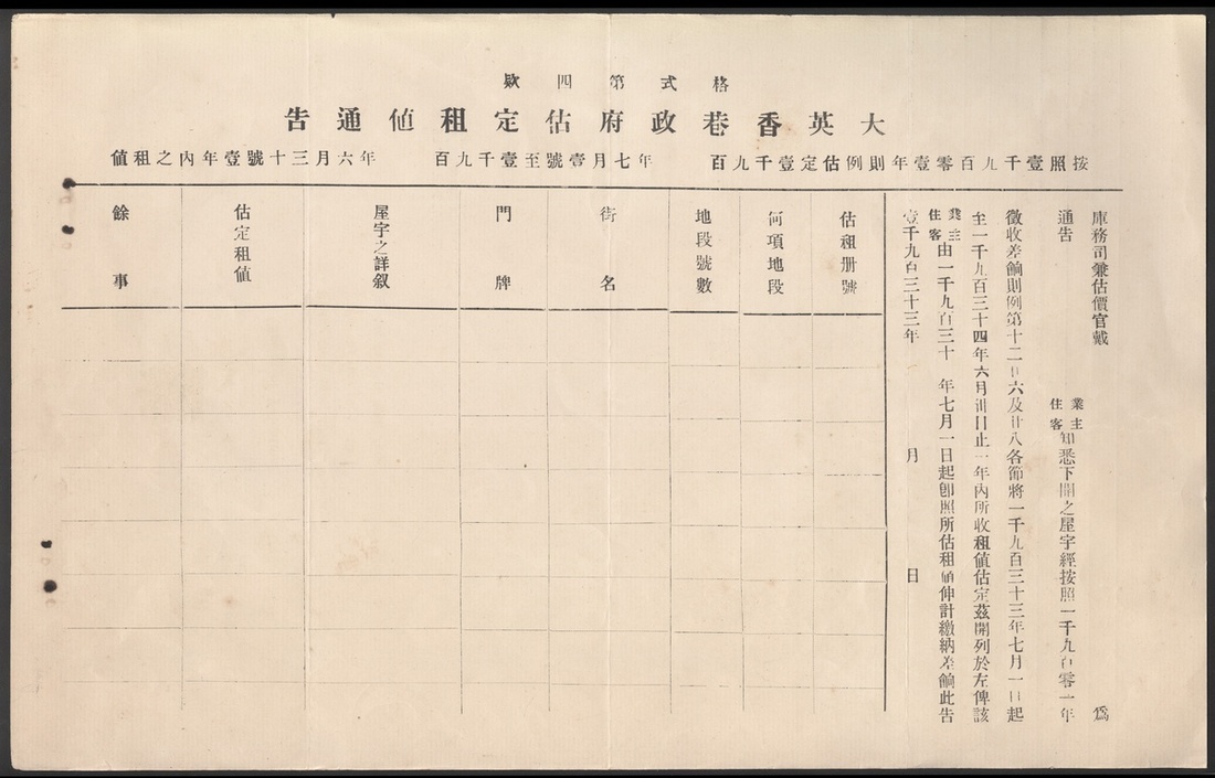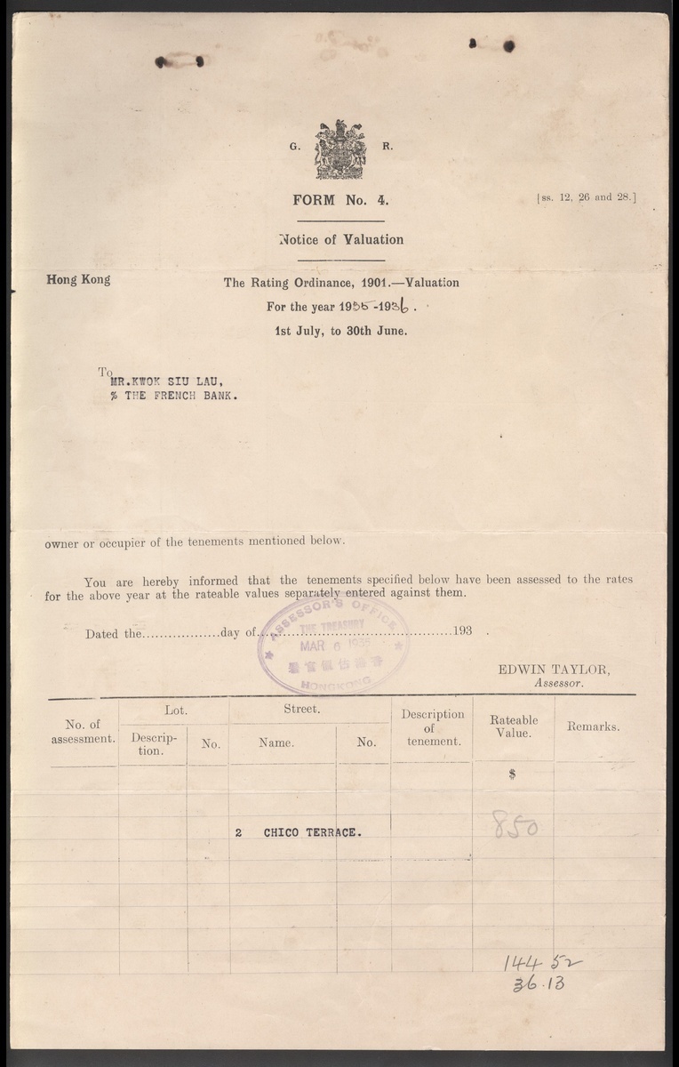 1935-1936 Annual Rates and Valuation Notice, stamped with a blue oval seal of the Hong Kong Assessor's Office/ The Treasury, and the property was appraised to Kwok Siu Lau, the former chairman of the Po Leung Kuk.