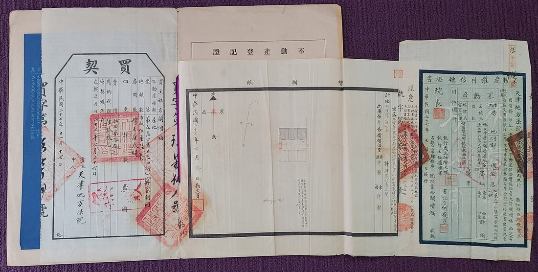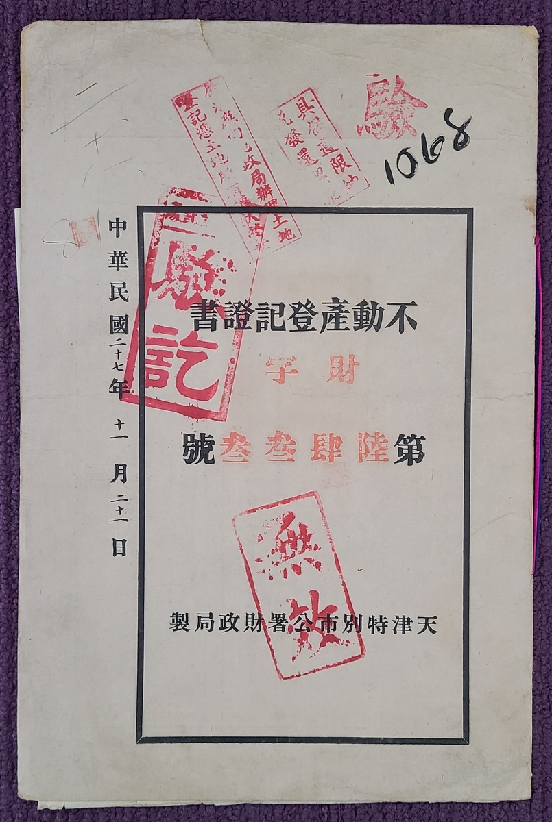 1938年日治時期之天津特別市公署財政局簽發之不動產登記証一份,內附房產地圖两幅.