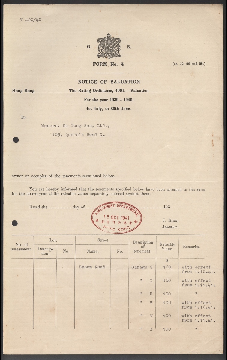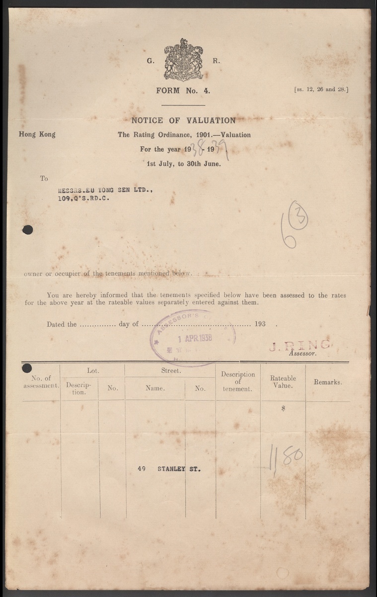 1938-1939, 1939-1940 two Annual Rates and Valuation Notice, stamped with a blue of red oval seal of the "Hong Kong Assessor's Office/ The Treasury", and the property was appraised to Yu Tung-sen, a big Hong Kong entrepreneur.