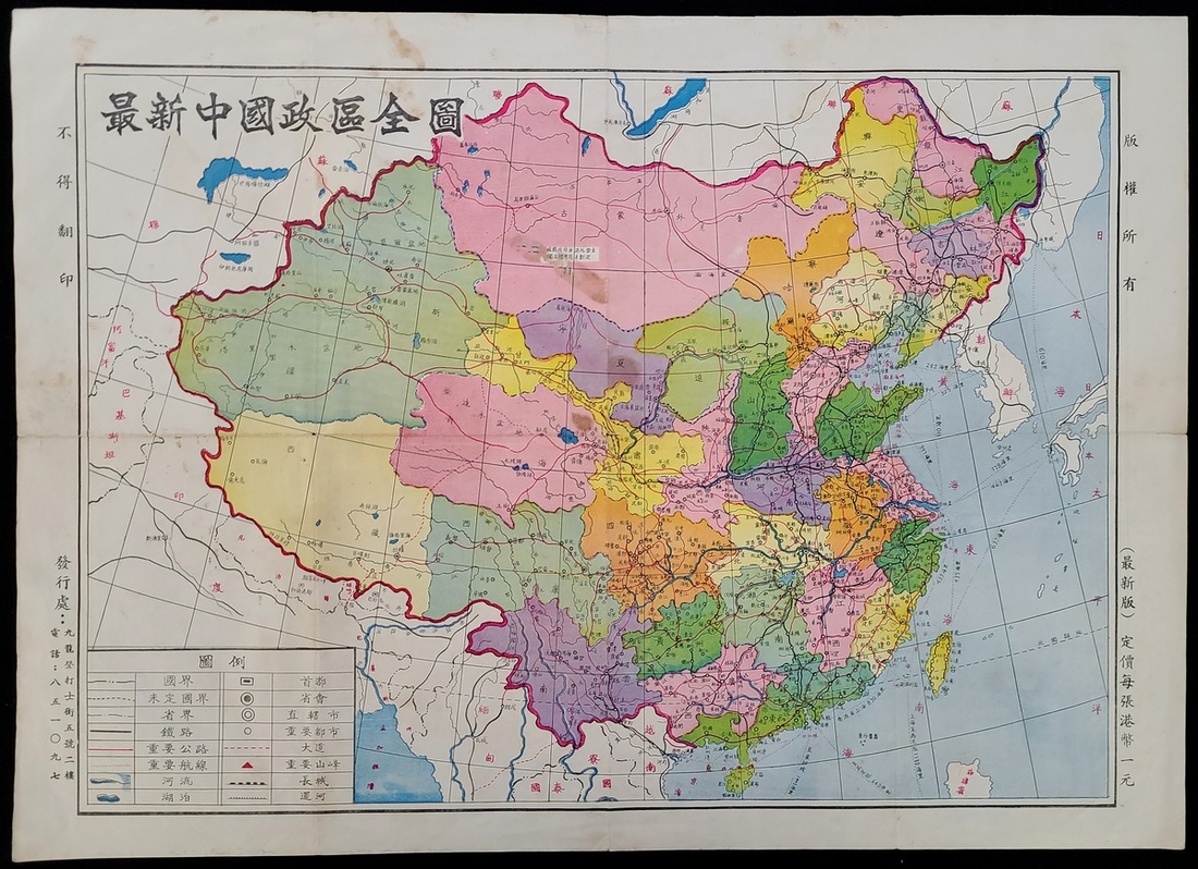 1940年代香港彩色印刷"最新中國政區全圖". 尺寸: 39x54cm