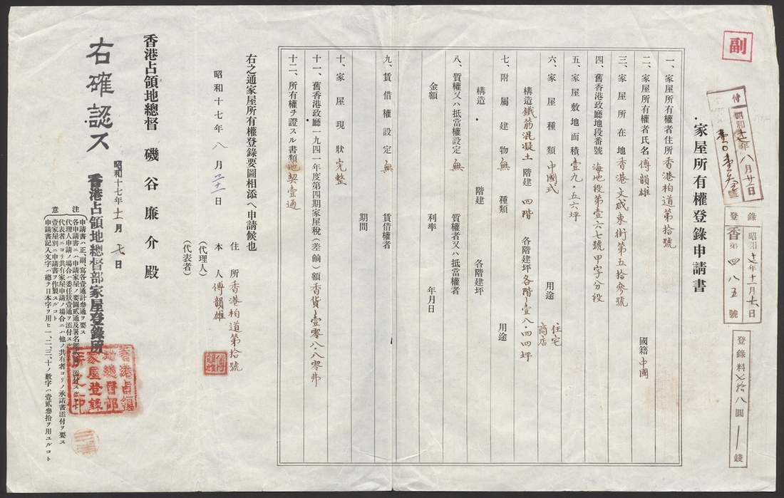 1942 (7 Nov.) "Application for Home Ownership Registration" during the Japanese occupation of Hong Kong. There is a red "Seal of the Home and Home Registration Office of the Governor of the Hong Kong Occupied Territory" to confirm the application. In good condition.