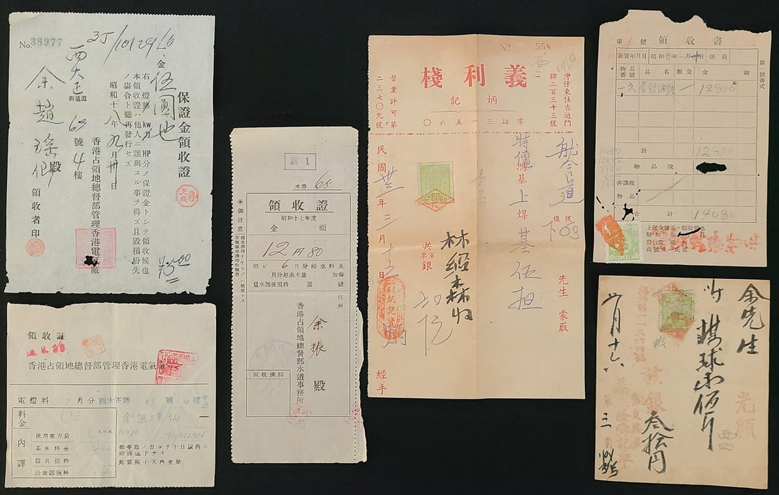 1942-44 six kinds of receipts during the Japanese occupation period in Hong Kong. Including electricity bills, electricity deposit receipts, water bills and other private receipts, some of which are affixed with tax stamps.