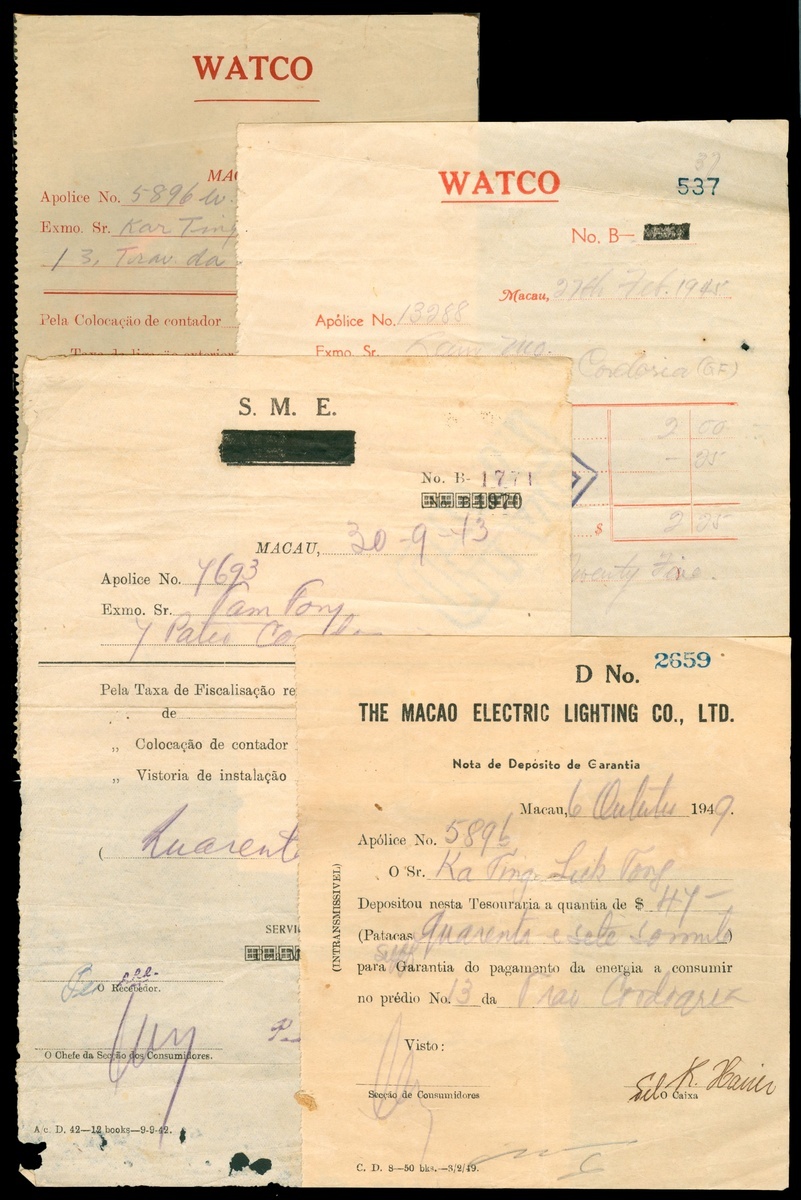 1943-59年澳門電力服務收據四張