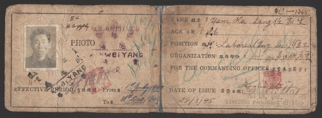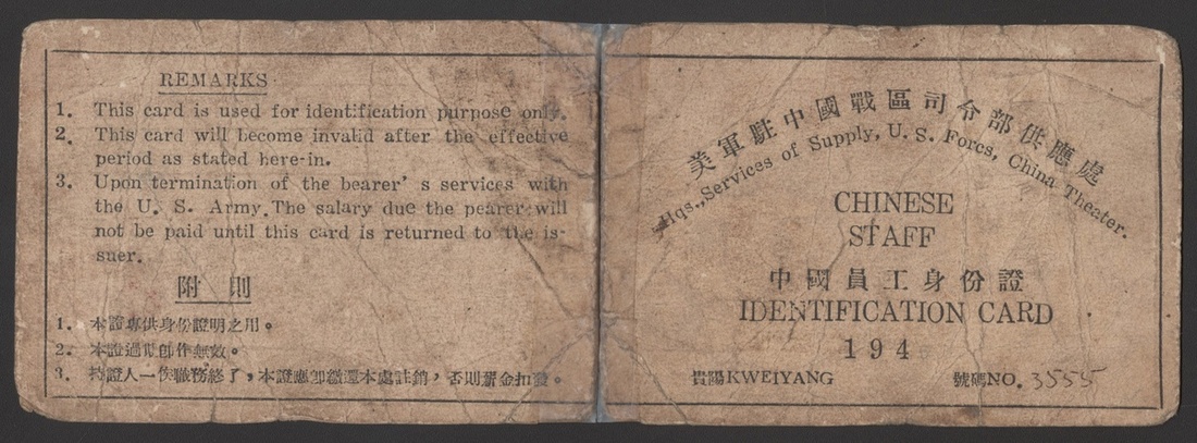 1945 a Identification Card of Chinese Staff, issued by Hqs., Services of Supply, U.S. Forcs, China Theater. Issued date: 28 Mar.,1945, Laction: Kweiyang. Rare.