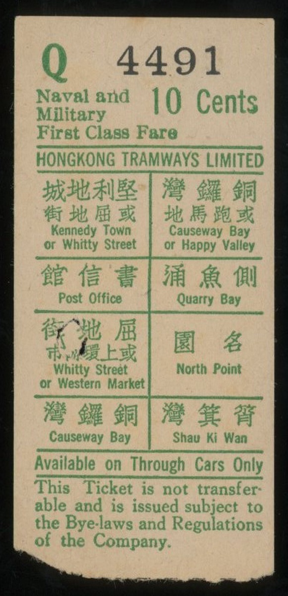 1946 The first generation of soldiers used first-class tram tickets after the war. Although the first-class fare was changed to 20 cents in 1946, soldiers still enjoyed half-price discounts. However, the word "British" on the tickets has been cancelled. Rare and well preserved.
