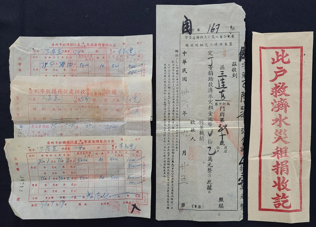 1947 A total of 4 receipts for Guangdong flood disaster donation and self-government fee donation receipts, plus a sticker "This household's flood relief rent donation receipt".