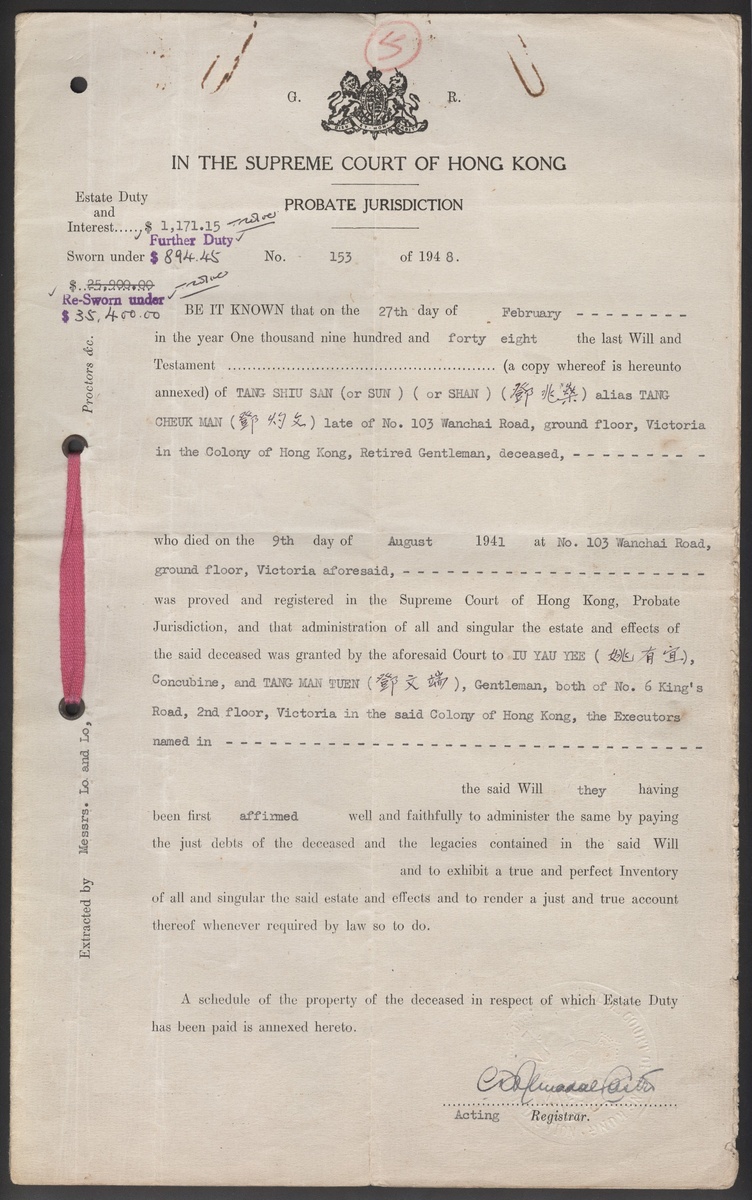 1948 a Probate Jurisdiction by the High Court on the estate of Mr. Tang Shiu-san, a gentry from the New Territories, with a written will of Tang Shiu-san in Chinese.