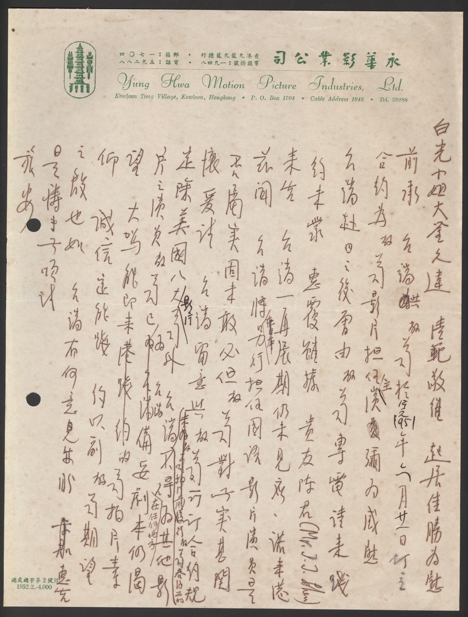 1950s a letter from Li Zuyong, the owner of Yung Hwa Motion Pictyre Industries Ltd., to Miss Bai Guang.