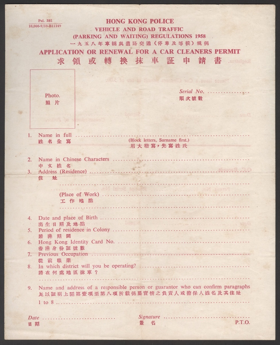 1950s a sheet of Hong Kong "Application or Renewal For A Car Cleaners Permit", very rare. Condition is fine.