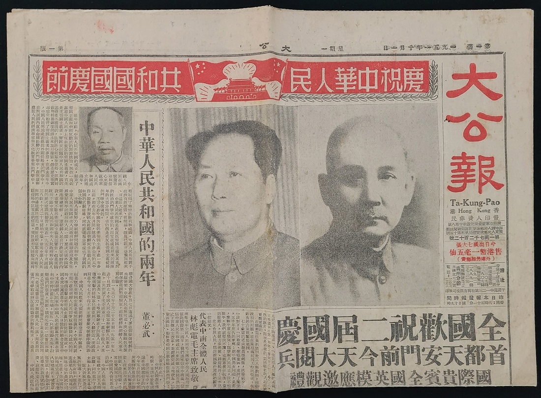1951 (1 Oct.) The first page to fourth page of Hong Kong Ta-Kung Pao, the titled on the frist page is "Celebrating the National Day of the People's Republic of China (the second anniversary of its founding).