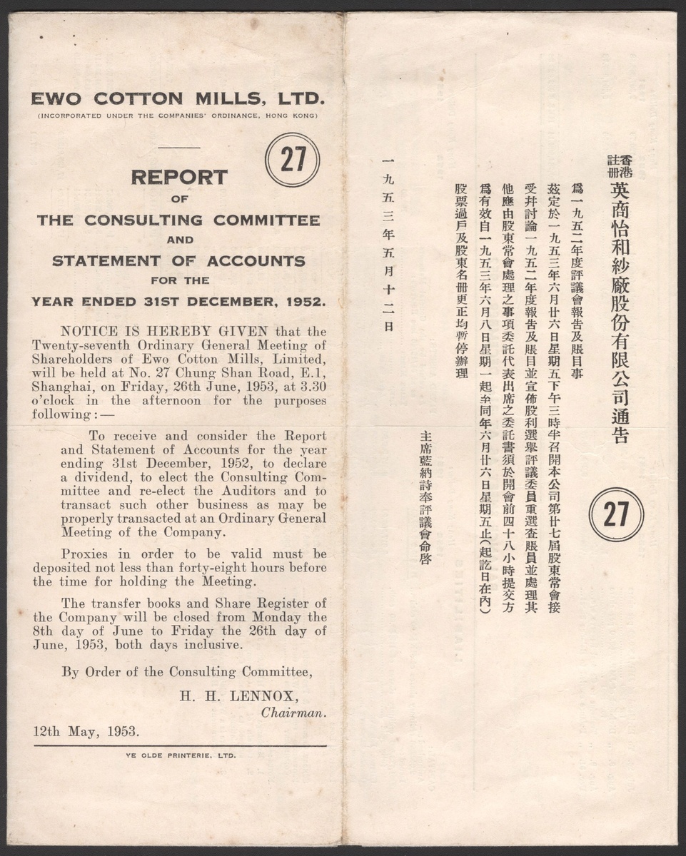 1953 (12 May) Report No. 27 of the Hong Kong registered British Ewo Cotton Mills Co., Ltd. The factory is in Shanghai.