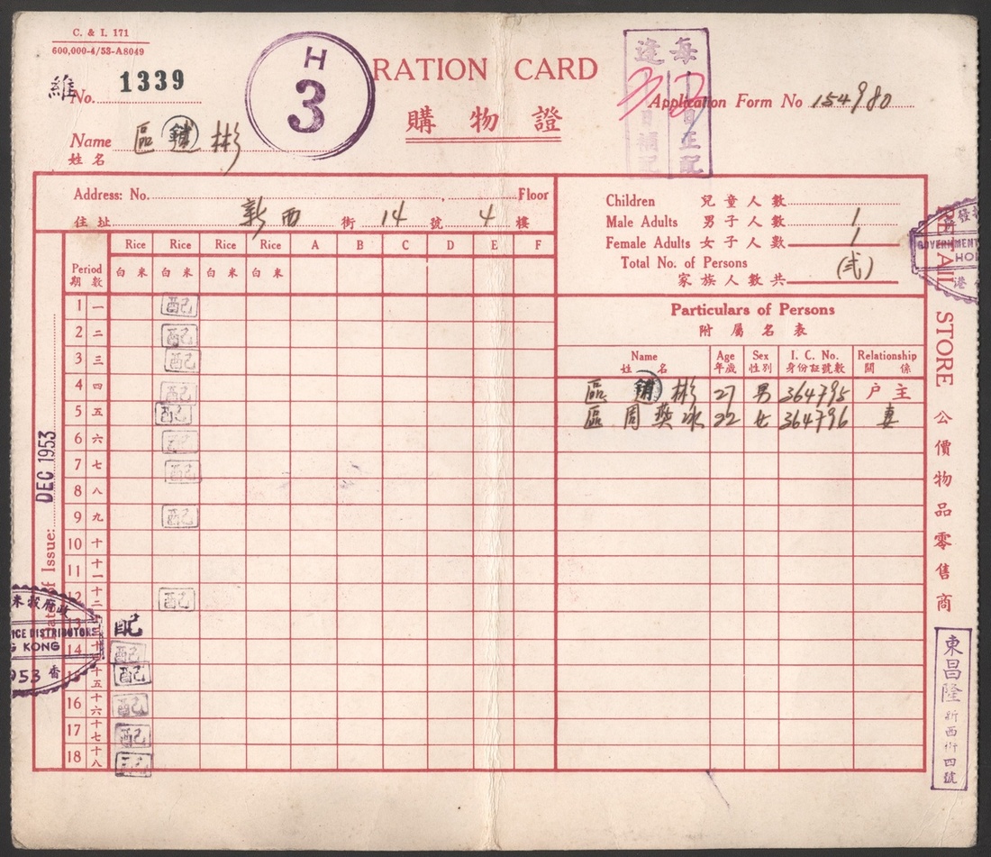1953 (Dec.) A "Ration Card" Issued by Government Distributors, Hong Kong. It is in order to control the purchase of rice.