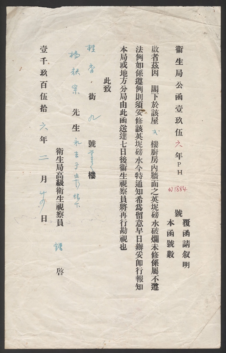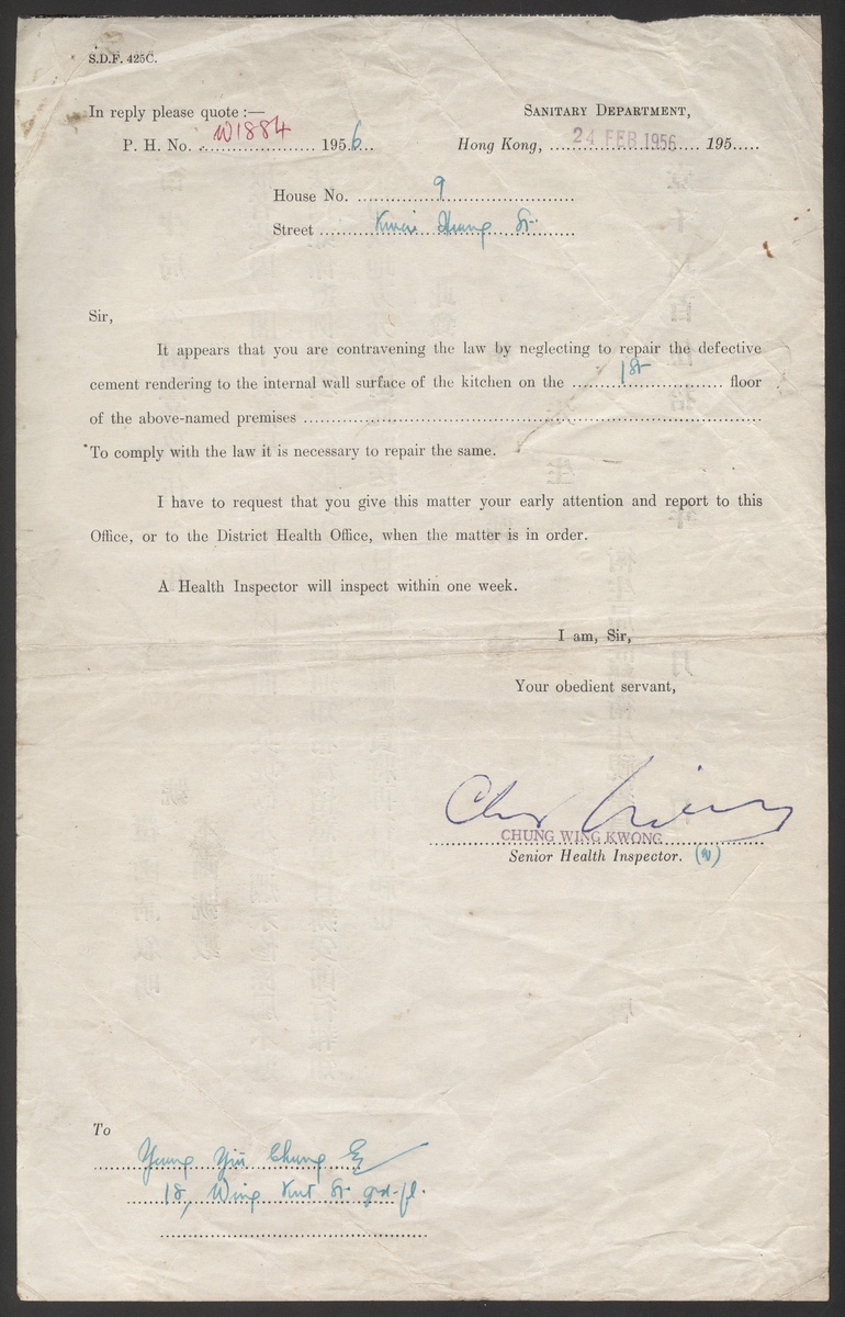 1956 (24 Feb.) a notification letter issued by the Hong Kong Health Bureau to repair the interior wall of the kitchen.