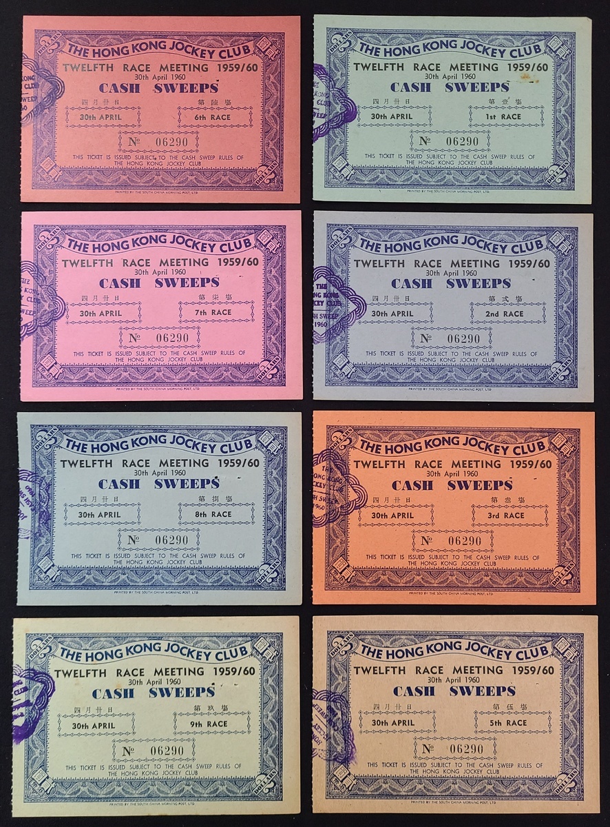 1960 (30 Apr.) The Twelfth Race Meeting of the Hong Kong Jockey Club, a total of eight Cash Sweeps of different colors from the first race to the 9th race (missing the forth race) , the same number is 06290. Rare.