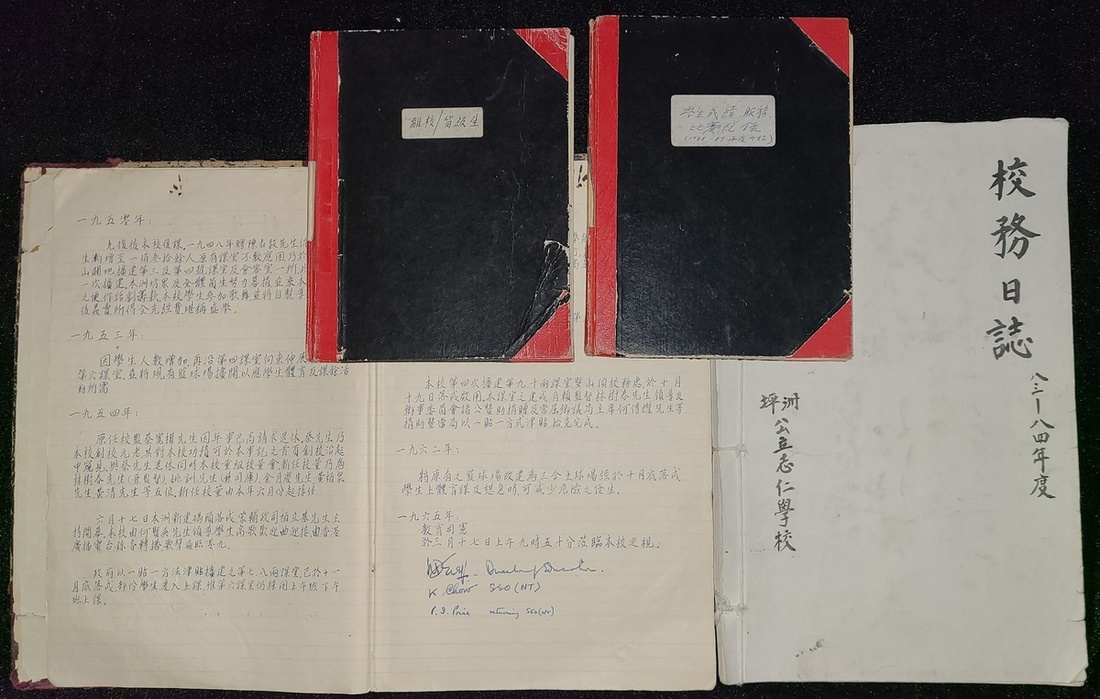 1965-84年坪洲公立志仁學校資料-組,包括1965年手寫創校沿起,具當年教育司憲簽名; 1983-84年度校務日誌及其他. 全部共四册.