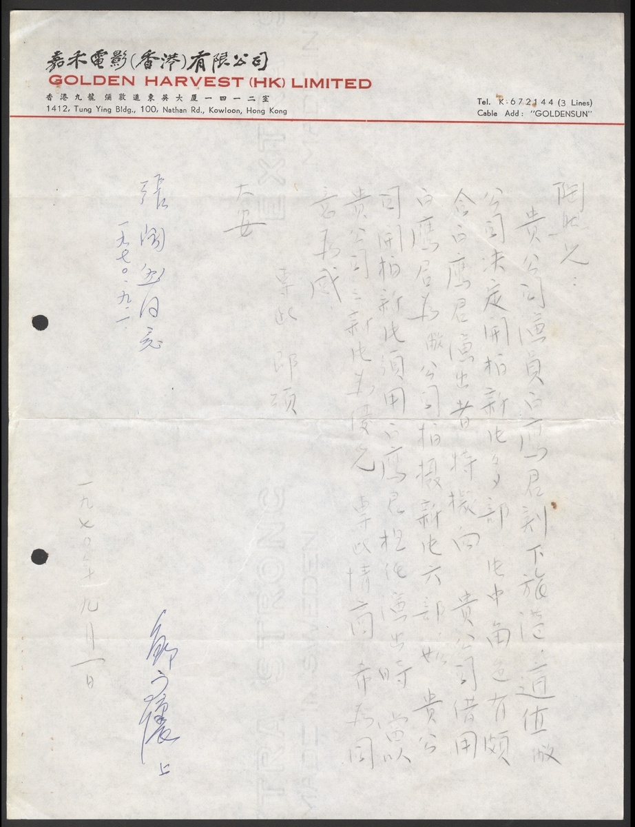 1970 (1 Sept.) a letter from Zou Wenhuai, the boss of Golden Harvest Film Company, Although the letter was a transcript, the signature was still written by Zou Wenhuai himself.