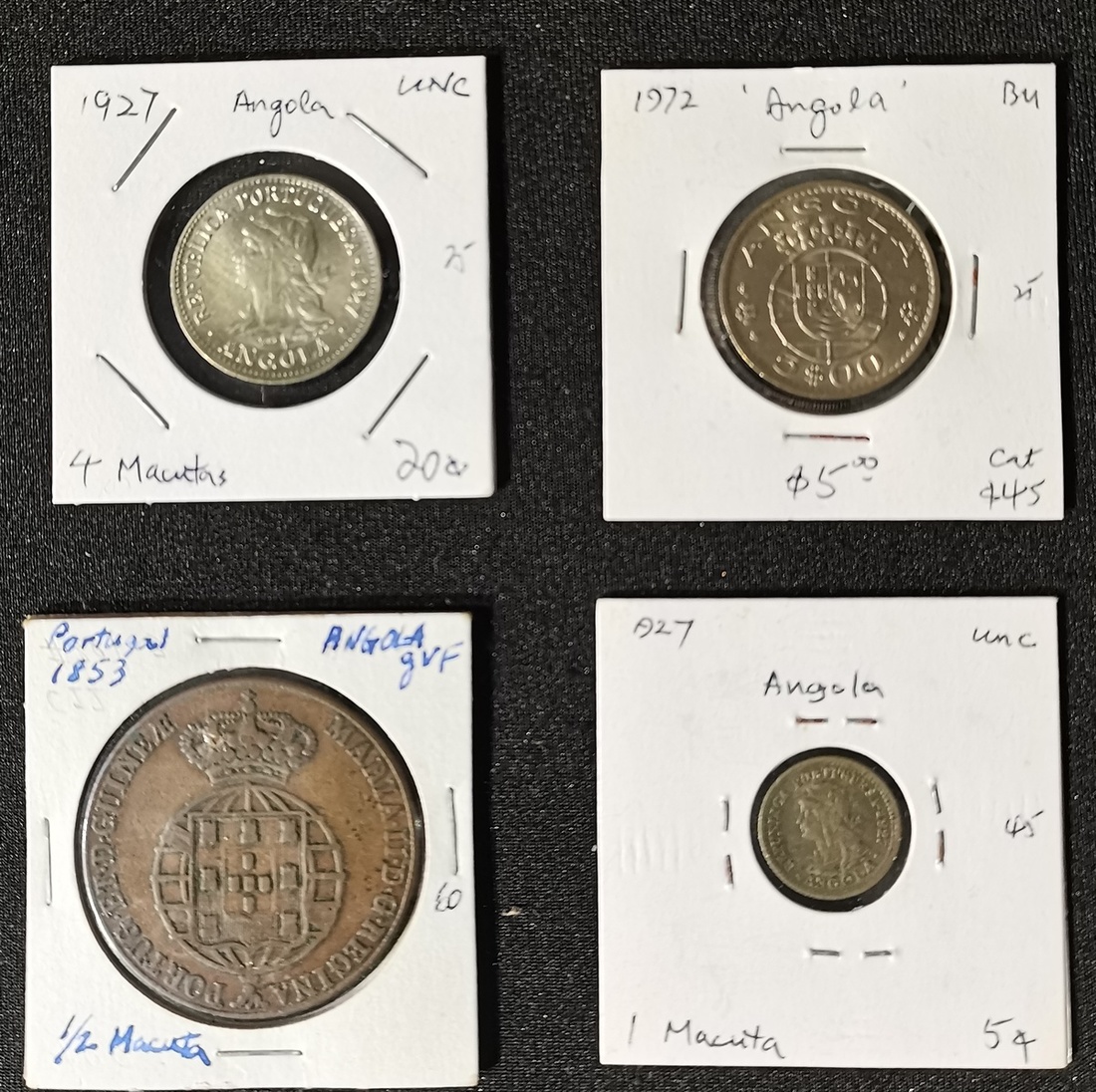 安哥拉錢幣4枚一組,包括1853年1/2 Mucata,1927年1 Mucata,1927年4 Mucata及1972年5元,EF至UNC,數枚帶原光