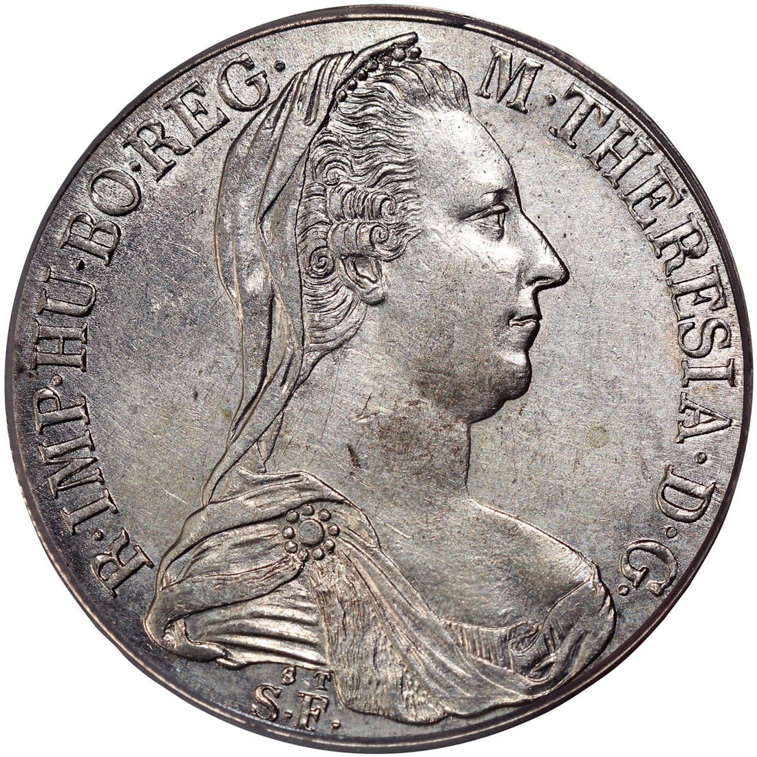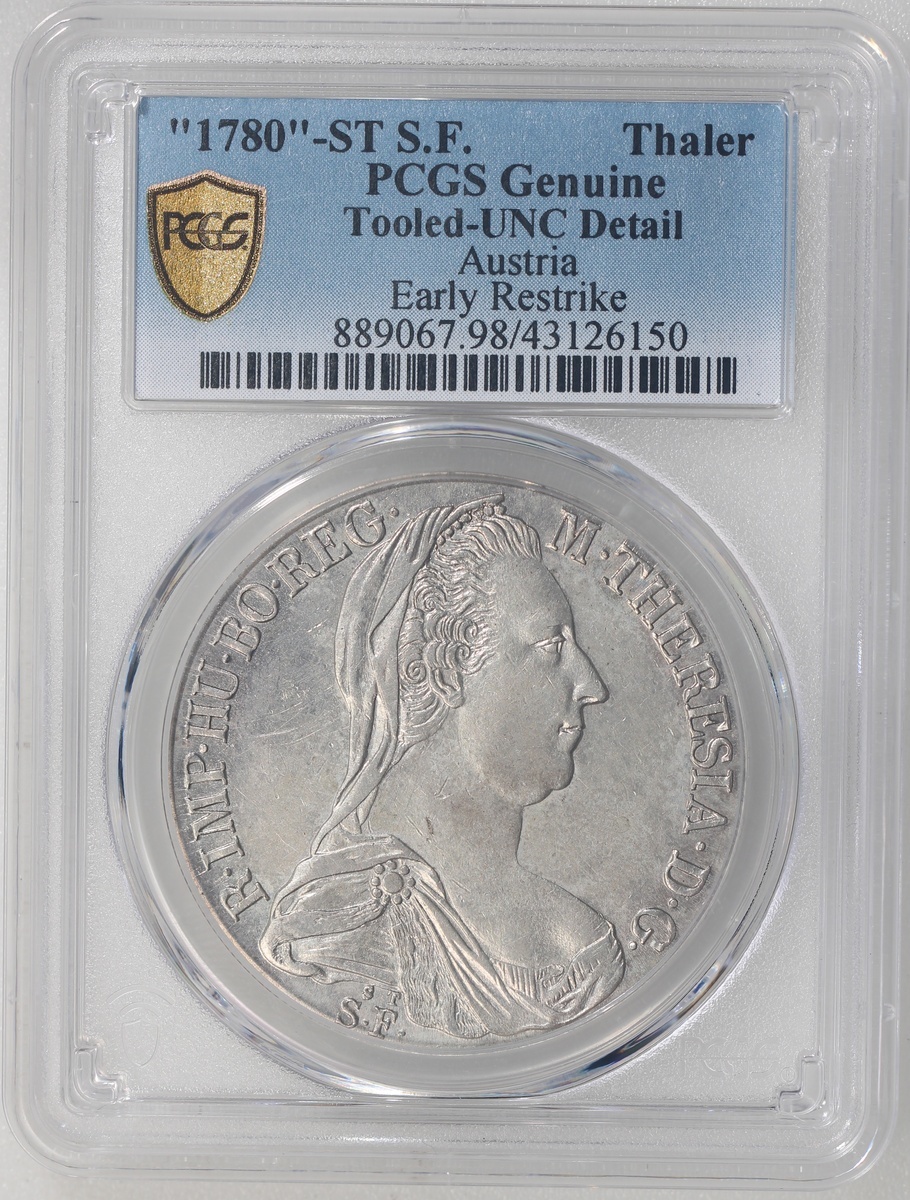 Austria, 1 thaler, "1780", early restike, 'ST S.F.' underneath bust of Empress Maria Theresia of Habsburg, PCGS UNC Detail (Tooled), Cert. #43126150