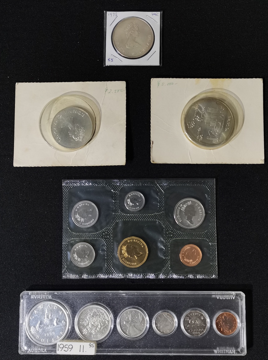 加拿大錢幣5枚一組,包括1959及1996年套幣,1976年5元奧運紀念幣2枚,及1976年10元奧運紀念幣,品相不一,數枚帶原光,建議預覽