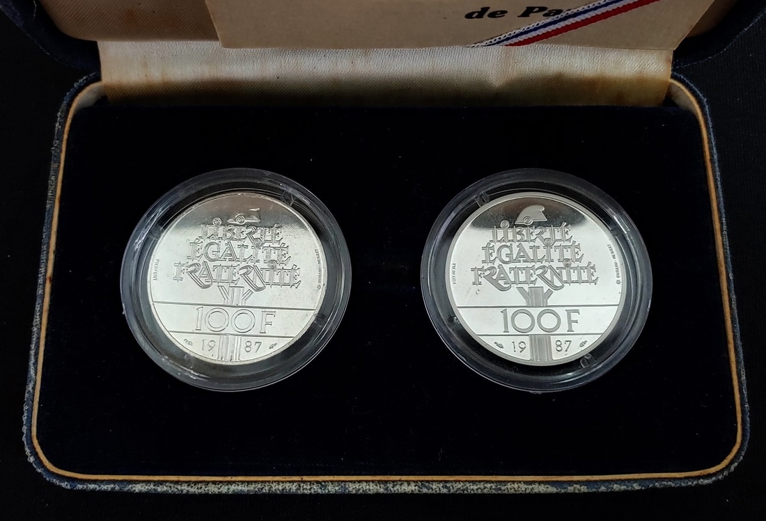 1987年法國100法郎加厚幣一套,精鑄幣及普鑄幣各一枚,附原盒及證書