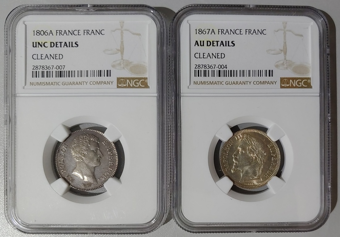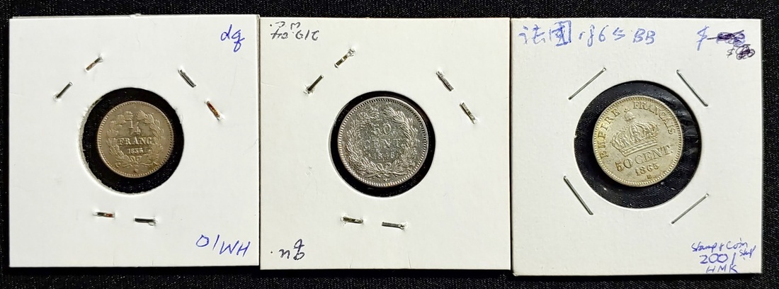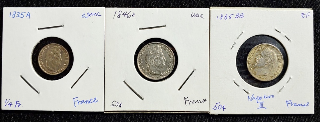 silver 50 cents, 1846A, 1865BB, and 1/4 francs, 1835A, the 1865BB 50 cents extremely fine, the rest uncirculated (3);