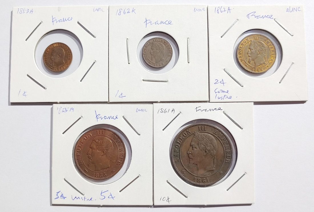 group of 5x bronze fractionals, 1 centime, 1853A and 1862K, 2 centimes, 1862A, 50 centimes, 1855A and 10 centimes, 1861A, uncirculated (5)