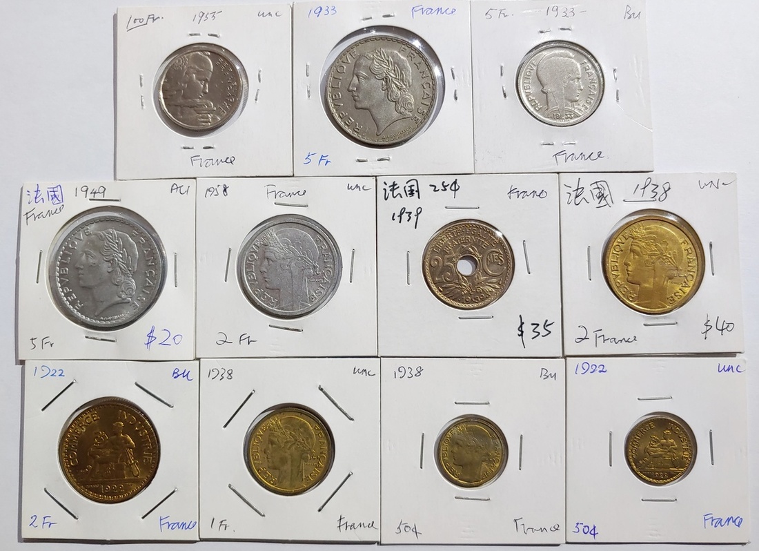 group of 11, consisting of: copper aluminium 50 centimes, 1922 and 1938, 1 franc, 1938, 2 francs, 1922 and 1938, copper nickel 25 centimes, 1939, aluminium 2 francs, 1958 and 5 francs, 1949, nickel 5 francs, 1933 (2), and copper nickel 100 francs, 1955, in general uncirculated (11);