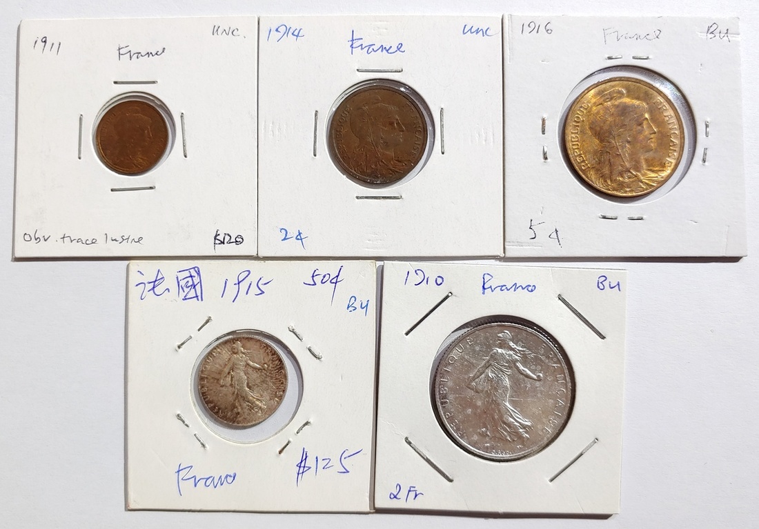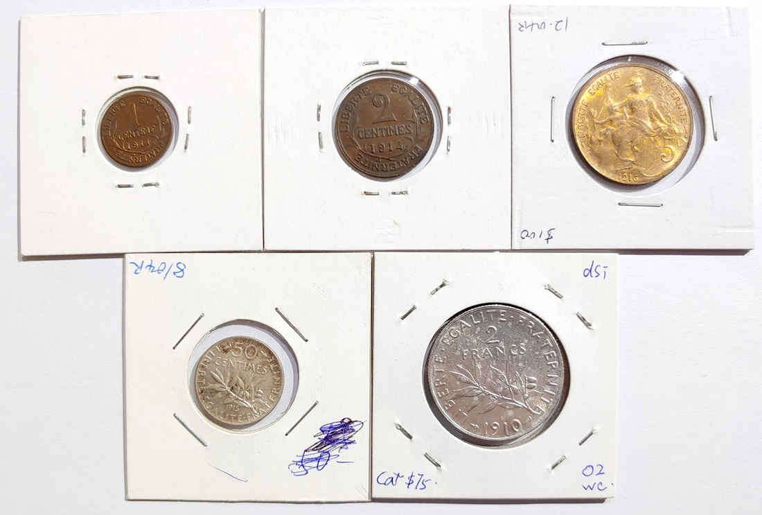group of 5, consisting of: brozne 1 centime, 1911, 2 centime, 1914 and 5 centime, 1916, silver 50 centime, 1915 and 2 Francs, 1910, uncirculated, the 50 centimes with toning. The 2 francs a better date for type (5);