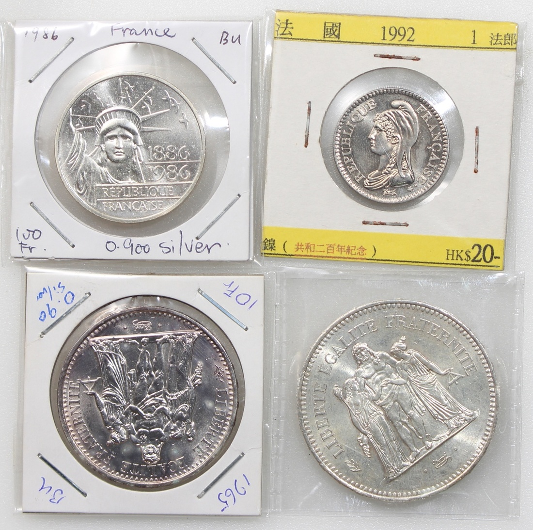France, lot of 28x coins, group of 4, consisting of nickel 1 Franc, 1992, silver 10 Francs, 1965, 50 Francs, 1978, and 100 Francs piedfort, 1986, uncirculated (4);